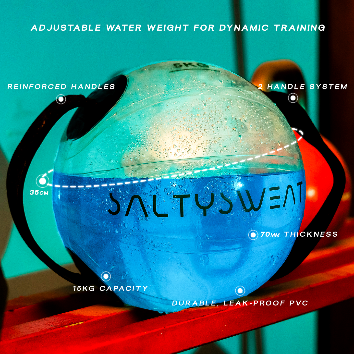 The HYDRO-X15, a 15 kg spherical aqua bag, is ideal for those looking to intensify their workouts. Its spherical shape allows for dynamic movements, making every exercise a core challenge.